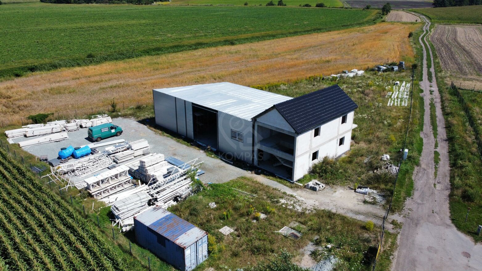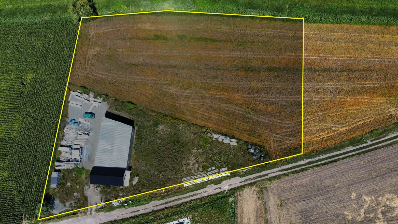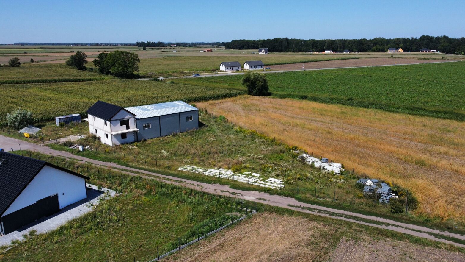 Działka jest wyposażona w prąd, a w drodze biegną instalacje wodociągowe i kanalizacyjne. Znajduje się tu również budynek biurowy z magazynem w stanie surowym otwartym, co daje możliwość szybkiego przystosowania nieruchomości do różnych celów biznesowych.